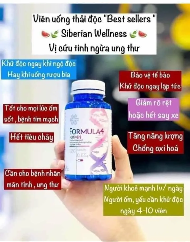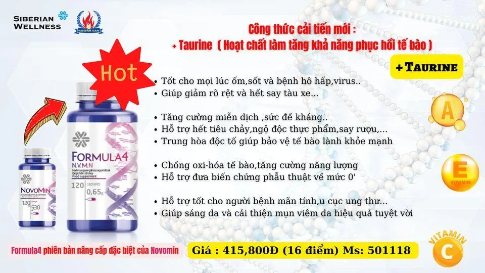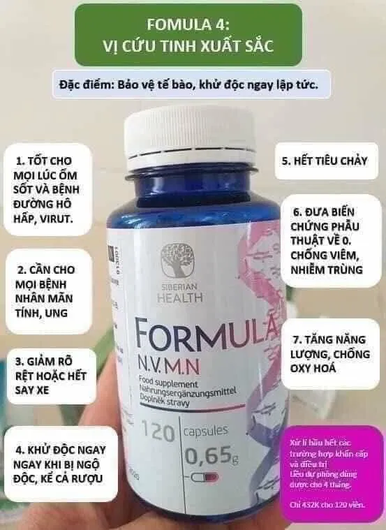 Thứ 3: "Formula 4 N.V.M.N" là nguồn cung cấp vitamin A, E và C kết hợp với taurine và axit alpha-lipoic hỗ trợ chống ôxy hóa, hỗ trợ tăng cường sức đề kháng. tăng cường miễn dịch, hỗ trợ người bị bệnh mãn tính, u cục, ung thư.